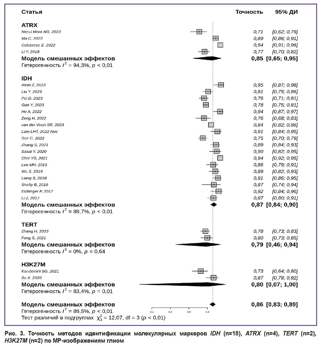 Проанализированы 42 публикации, в которых на основе методов радиомики и машинного обучения по данным МР-изображений глиальных опухолей прогнозировали статус молекулярных биомаркеров, включая мутации генов IDH, ATRX, BRAF, H3K27M, промотора TERT, коделецию 1p/19q, метилирование промотора гена MGMT, пролиферативную активность (индекс мечения Ki-67) и др. Обобщенная точность таких методов оказалась высокой и составила 0,86 [0,83; 0,89]. Тем не менее в работах выявлена существенная методологическая гетерогенность, в частности связанная с отсутствием единых стандартов выбора положения, размера и формы зоны интереса для извлечения лучевых биомаркеров, что является серьезным препятствием для воспроизведения полученных экспериментальных результатов в клинической практике. Следовательно, вопрос стандартизации методов радиомики остается актуальным для дальнейших исследований глиальных опухолей.