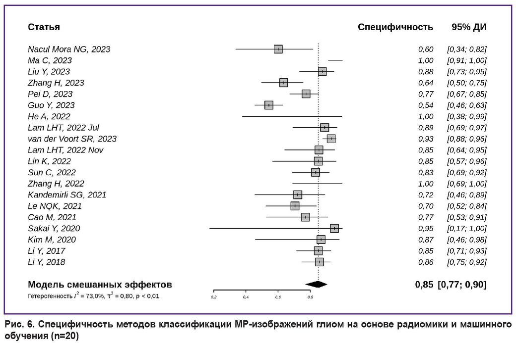 Специфичность диагностики на основе радиомики и машинного обучения демонстрируют рис. 6 и 7. Обобщенная специфичность изученных методов превысила чувствительность и составила 0,85 с 95% ДИ [0,77; 0,90] (рис. 6) [7, 8, 10–14, 16, 18, 19, 21, 22, 25, 26, 29, 38, 39, 43, 44, 45].