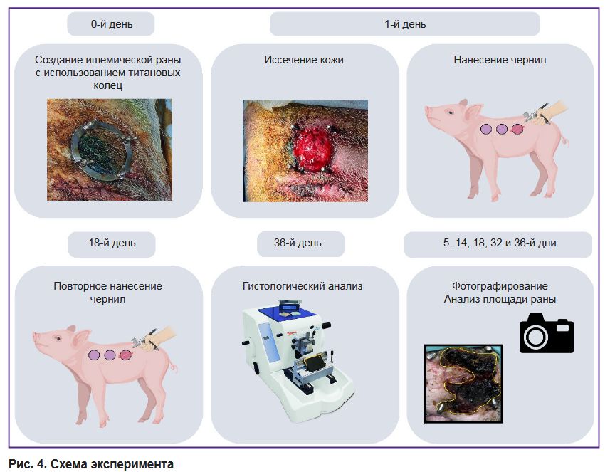 Моделирование раны. Для моделирования ишемической раны применяли метод, основанный на использовании титановых колец для сдавливания кожи, который ранее применялся в аналогичных исследованиях [25]. Для эксперимента был выбран самец вьетнамской вислоухой свиньи породы везинау в возрасте 1 год массой тела 45 кг. Перед операцией свинью седировали 12 мг/кг Золетила и 12 мг/кг Медитина и очищали кожу. Первичная операция заключалась в создании карманов на боковых поверхностях животного посредством рассечения внешнего покрова и отделения дермы от подкожно-жировой клетчатки слева и справа от изначального разреза. Всего было по два иссечения с каждого бока на расстоянии 25 см друг от друга. В получившиеся карманы внедряли нижние уплотнительные кольца из титана с болтами (d=5 см) (рис. 3, а). Устройством для панч-биопсии (Apexmed, Индия) диаметром 8,0 мм проделывали отверстия для болтов, после чего устанавливали верхнее кольцо и фиксировали его винтами (рис. 3, б). Спустя 24 ч свинью снова седировали, проводили предоперационную подготовку, после чего, удалив верхнее кольцо, иссекали кожу по диаметру (рис. 3, в). Затем наносили гидрогель со сфероидами или без в зависимости от группы с использованием смесителя (рис. 3, г), а контрольную рану оставляли без лечения. Раны обрабатывали с интервалом в 3–4 дня. Антибиотикотерапию проводили каждый день с использованием цефтриаксона в дозе 20 мг/кг и 5% энрофлоксацина в дозе 45 мг/кг, анальгетическую терапию — с использованием мелоксикама в дозе 300 мг/кг. На 18-й день после операции вновь наносили биочернила. На 36-й день животное выводили из эксперимента Пропофолом-Липуро (10 мг/кг) и лидокаином (10 мг/кг), после чего образцы тканей передавали на гистологическое исследование.