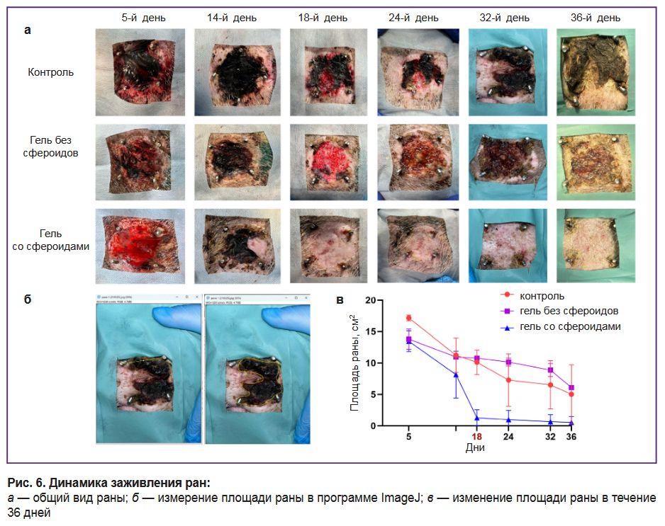 Общая оценка заживления ран. На 5-й день раневые поверхности во всех группах были покрыты толстым слоем рыхлого фибрина (рис. 6, а). К 14-му дню площадь раны снижалась примерно на 35, 30 и 40% в группах «контроль», «гидрогель без сфероидов» и «гидрогель со сфероидами» соответственно. Заметные отличия были выявлены на 18-й день, когда в группе «гидрогель со сфероидами» площадь раны уменьшилась на 90% и составила 1,28±0,70 см2 против 10,8±0,4 см2 для группы «гель без сфероидов» и 10,12±0,28 см2 для контроля (рис. 6, в). На 18-й день также проводилось повторное лечение. К 36-му дню рана в группе «гидрогель со сфероидами» полностью эпителизовалась и зажила, тогда как в группах «контроль» и «гидрогель без сфероидов» рана сохранялась (см. рис. 6, а, в).