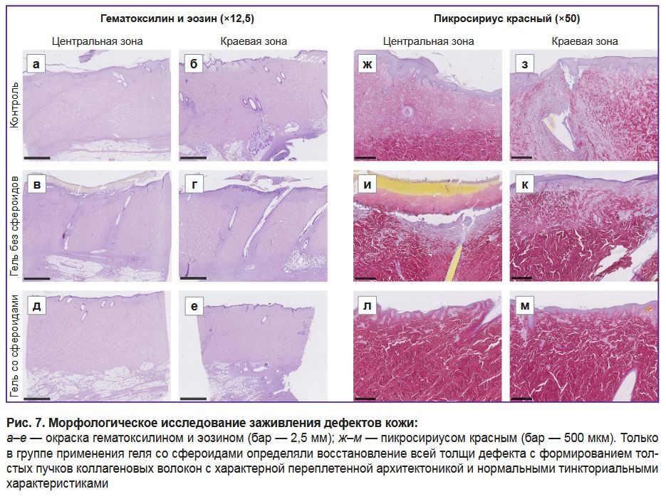 В группе применения геля со сфероидами (рис. 7, д, е, л, м) во всех образцах раны были выстланы непрерывным эпителием. Поверхностные дефекты дермы были тонкими, в них активно происходила реорганизация с формированием новых толстых пучков коллагеновых волокон. В отдельных зонах под эпителием ткань была очагово более рыхлой, однако бóльшая ее часть представляла собой фиброзированную грануляционную ткань с высоким содержанием внеклеточного матрикса и без признаков активного воспаления. В краевых зонах (см. рис. 7, е, м) наблюдалось полное восстановление дермы: внеклеточный матрикс был полностью представлен толстыми пучками коллагеновых волокон с нормальными тинкториальными свойствами. Тем не менее можно было установить признаки регенерации: в дерме определялись прослойки рыхлой соединительной ткани с кровеносными сосудами.